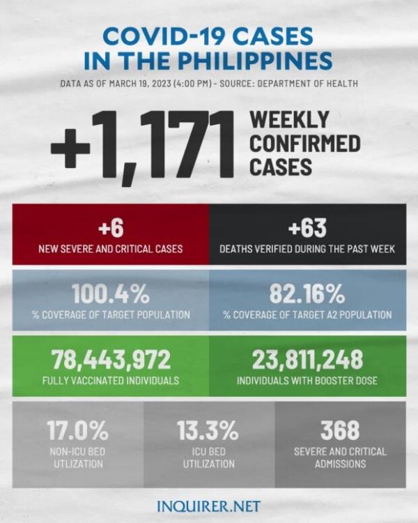 菲律宾马尼拉- 3月13日至19日,菲律宾卫生部共记录了1171例COVID-19感染病例,略高于上周登记的983例感染病例。
