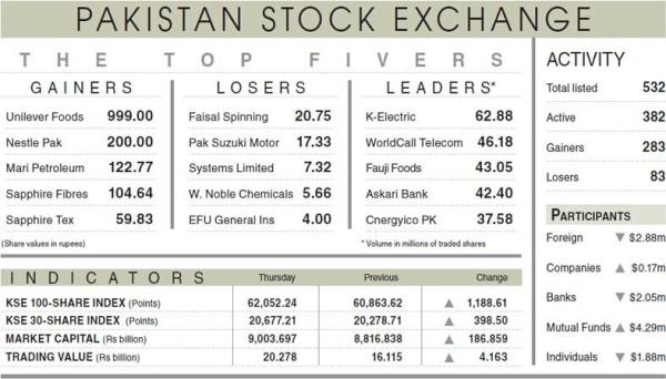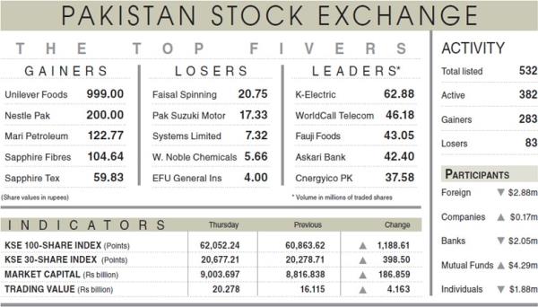 KSE-100指数比前一天上涨1188.61点(1.95%),以62052.24点收盘。