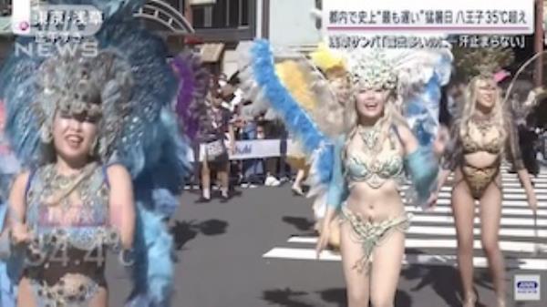 在这个漫长的周末,一股炎热的夏末热浪席卷了东京,恰逢浅草桑巴狂欢节,舞者们在酷热中旋转。